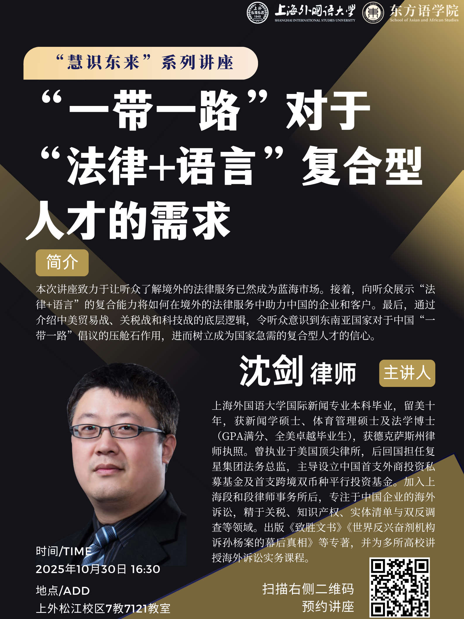 本次讲座由三个部分组成。首先,通过分享中国企业(福建晋华、小米、海康威视等)在应对美国实体清单制裁的诉讼战中的成功经验,让听众了解在国家“理直气壮地以法维权”的号召下,境外的法律服务已然成为蓝海市场。接着,通过复盘孙杨案中的外语法条解读的得失,向听众展示“法律+语言”的复合能力将如何在境外的法律服务中助力中国的企业和客户。最后,通过介绍中美贸易战、关税战和科技战的底层逻辑,令听众意识到东南亚国家对于中国“一带一路”倡议的压舱石作用,进而树立成为国家急需的复合型人才的信心。