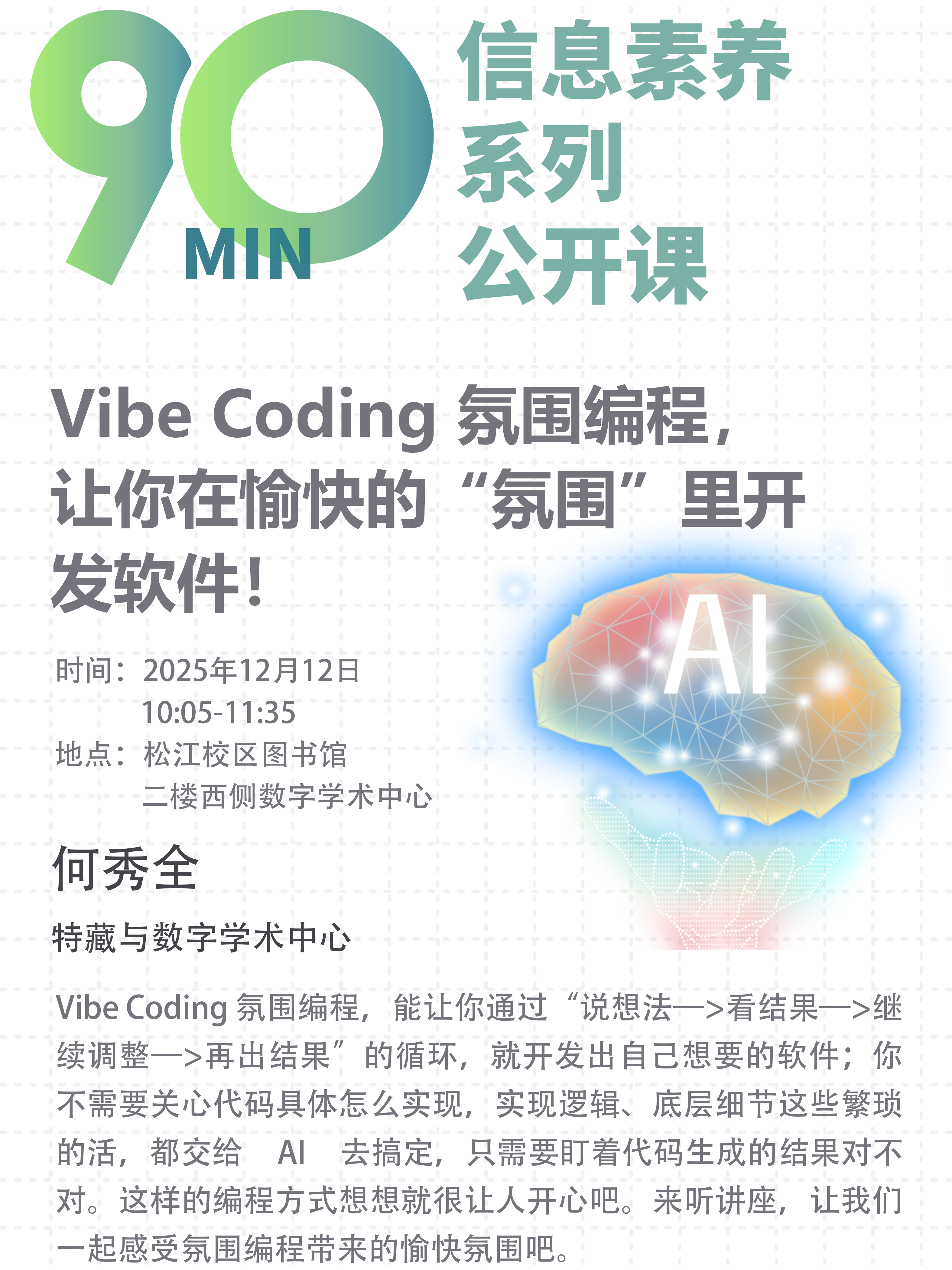 Vibe Coding 氛围编程,能让你通过“说想法—>看结果—>继续调整—>再出结果”的循环,就开发出自己想要的软件;你不需要关心代码具体怎么实现,实现逻辑、底层细节这些繁琐的活,都交给 AI 去搞定,只需要盯着代码生成的结果对不对。这样的编程方式想想就很让人开心吧。来听讲座,让我们一起感受氛围编程带来的愉快氛围吧。