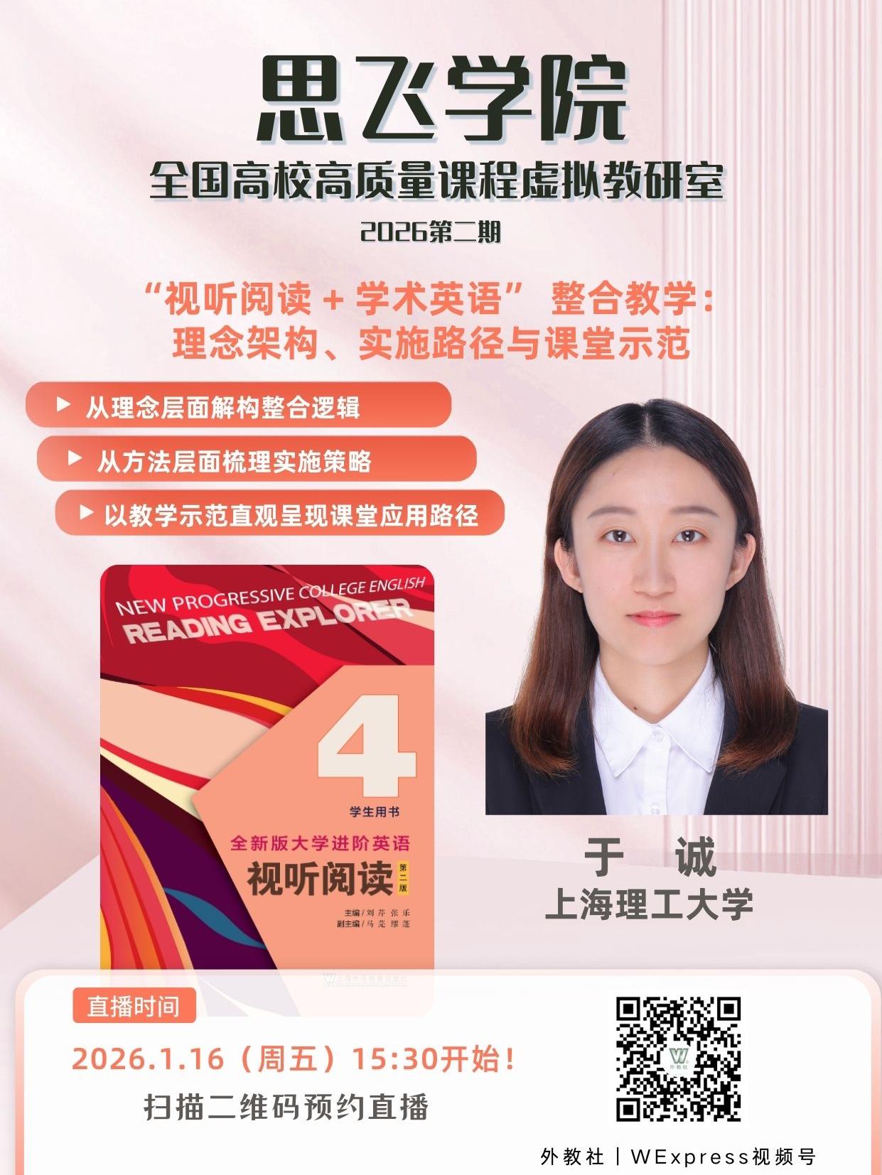 本场讲座聚焦外教社新版《视听阅读》(第 2 版)与学术英语能力的整合教学,从理念层面解构整合逻辑,从方法层面梳理实施策略,以教学示范直观呈现课堂应用路径。