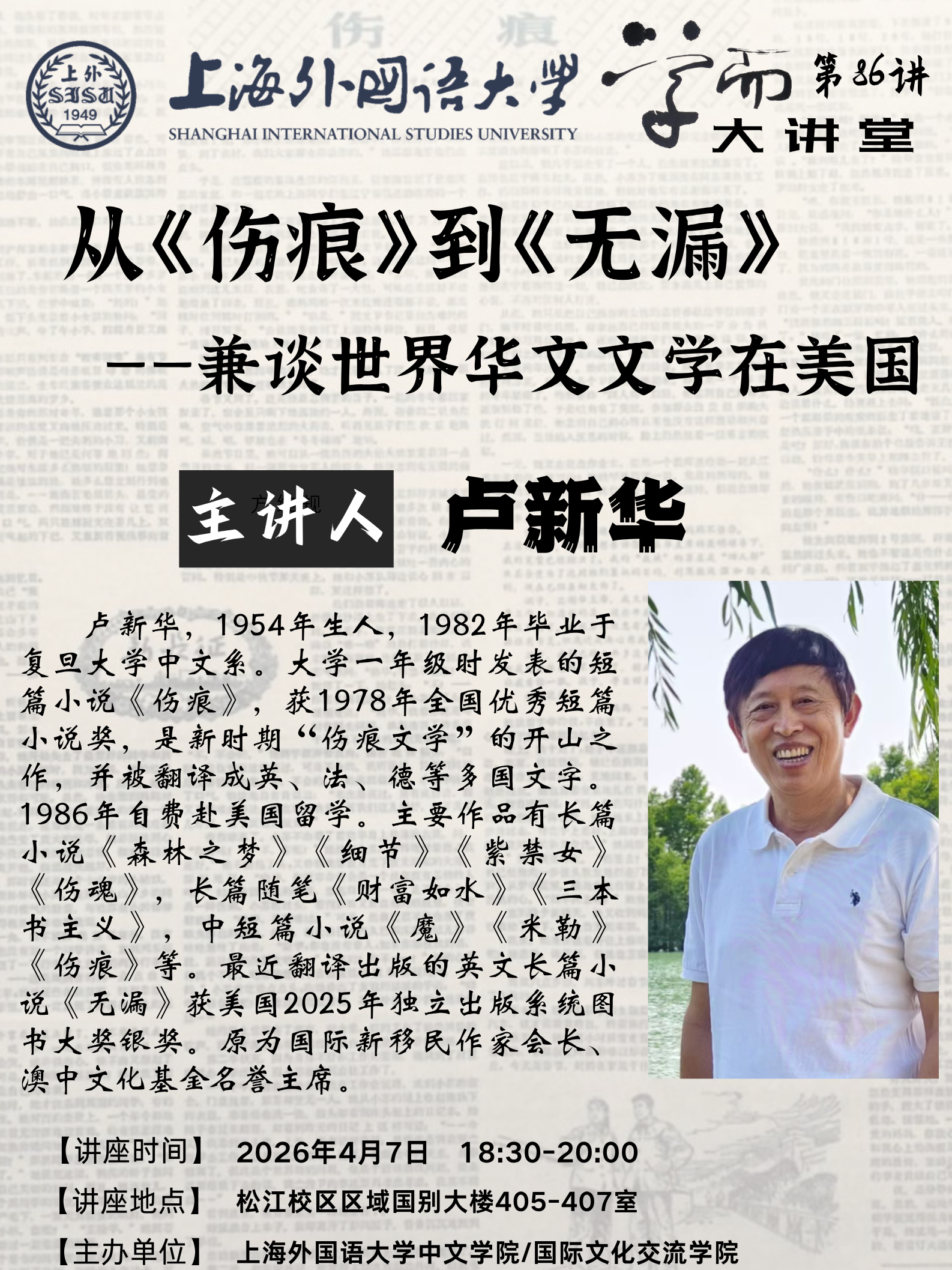 1954年生人,1982年毕业于复旦大学中文系。大学一年级时发表的短篇小说《伤痕》,获1978年全国优秀短篇小说奖,是新时期“伤痕文学”的开山之作,并被翻译成英、法、德等多国文字。1986年自费赴美国留学。主要作品有长篇小说《森林之梦》《细节》《紫禁女》《伤魂》,长篇随笔《财富如水》《三本书主义》,中短篇小说《魔》《米勒》《伤痕》等。最近翻译出版的英文长篇小说《无漏》获美国2025年独立出版系统图书大奖银奖。原为国际新移民作家会长、澳中文化基金名誉主席。