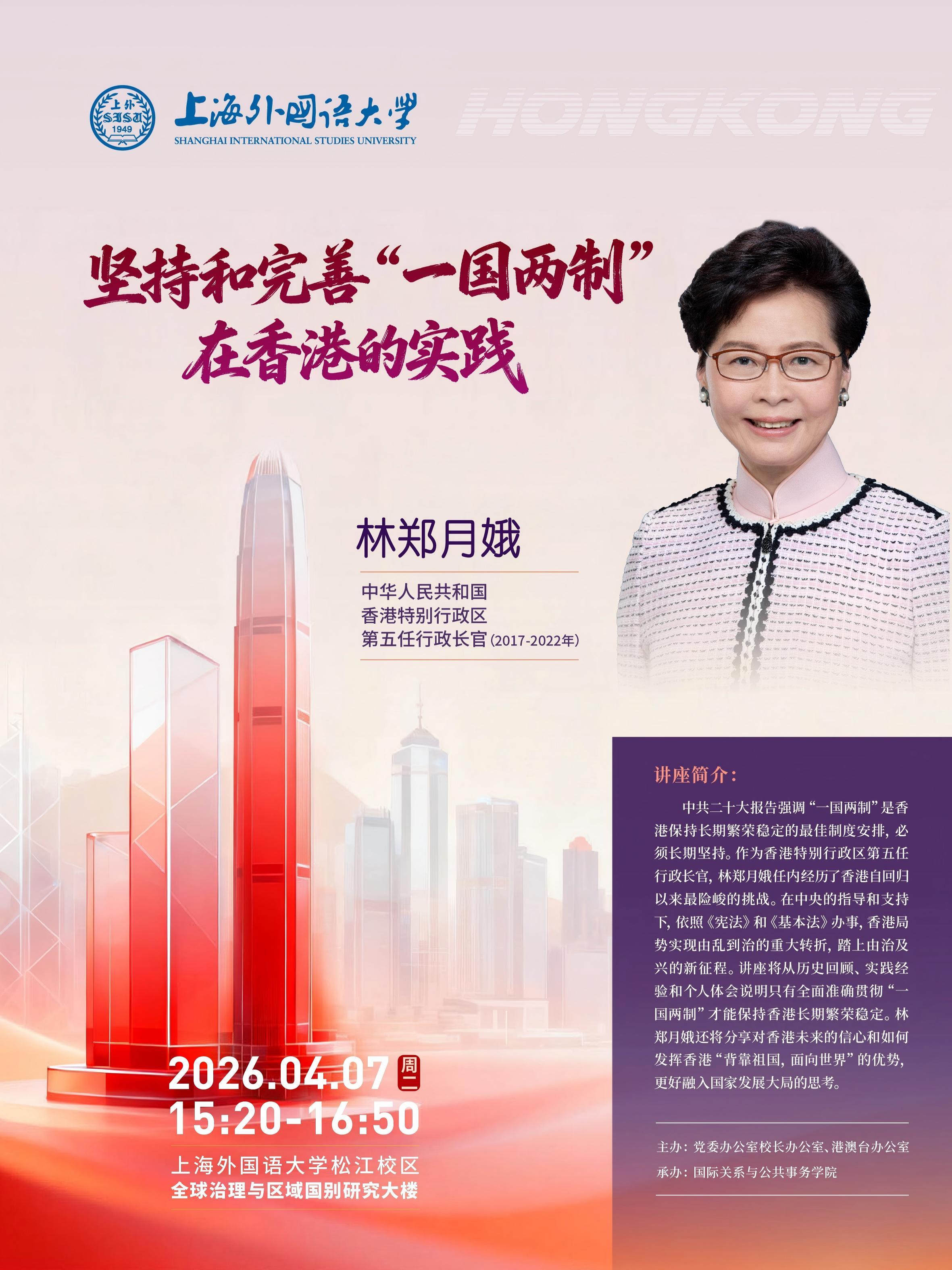 中共二十大报告强调“一国两制”是香港保持长期繁荣稳定的最佳制度安排,必须长期坚持。作为香港特别行政区第五任行政长官,林郑月娥任内经历了香港自回归以来最险峻的挑战。在中央的指导和支持下,依照《宪法》和《基本法》办事,香港局势实现由乱到治的重大转折,踏上由治及兴的新征程。讲座将从历史回顾、实践经验和个人体会说明只有全面准确贯彻“一国两制"才能保持香港长期繁荣稳定。林郑月娥还将分享对香港未来的信心和如何发恽香港“背靠祖国,面向世界”的优势,更好融入国家发展大局的思考。