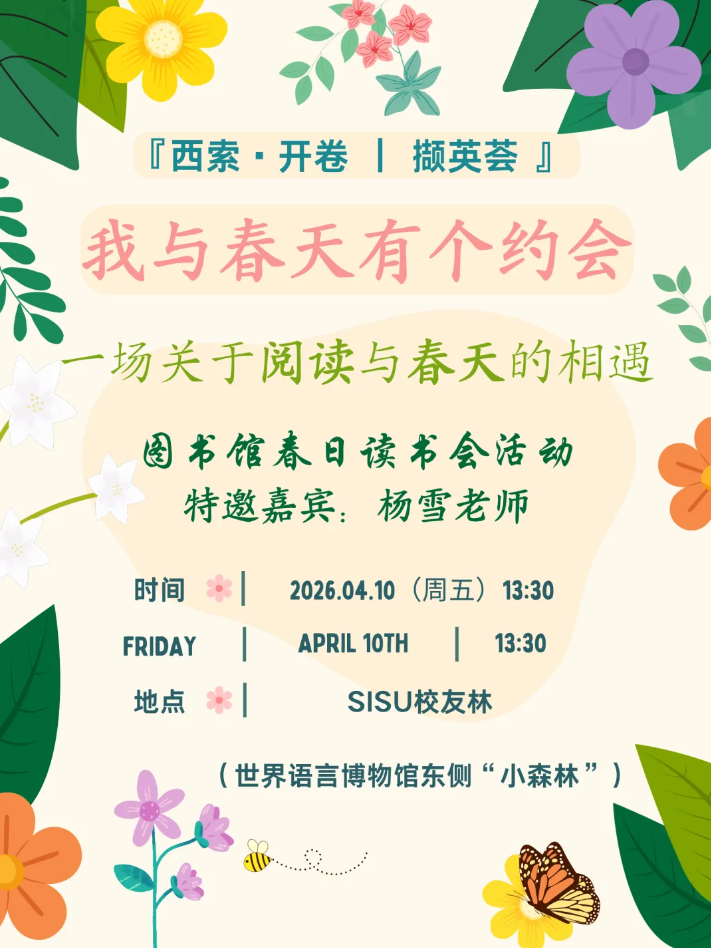 品牌 西索·开卷,撷英荟 主讲人 杨雪 开始时间 2026年04月10日(周五)13:30 结束时间 2026年04月10日(周五)15:00 地点 松江校区-SISU校友林(世界语言博物馆东侧“小森林”) 主办方 图书馆 语言 汉语 分享: 收藏 活动详情 内容提要 在春天里 我们想把阅读还给心动 邀您带着一本喜欢的书 赴一场和文字、自然以及自己有关的约会。 人物简介 杨雪 新闻报道 暂无新闻报道