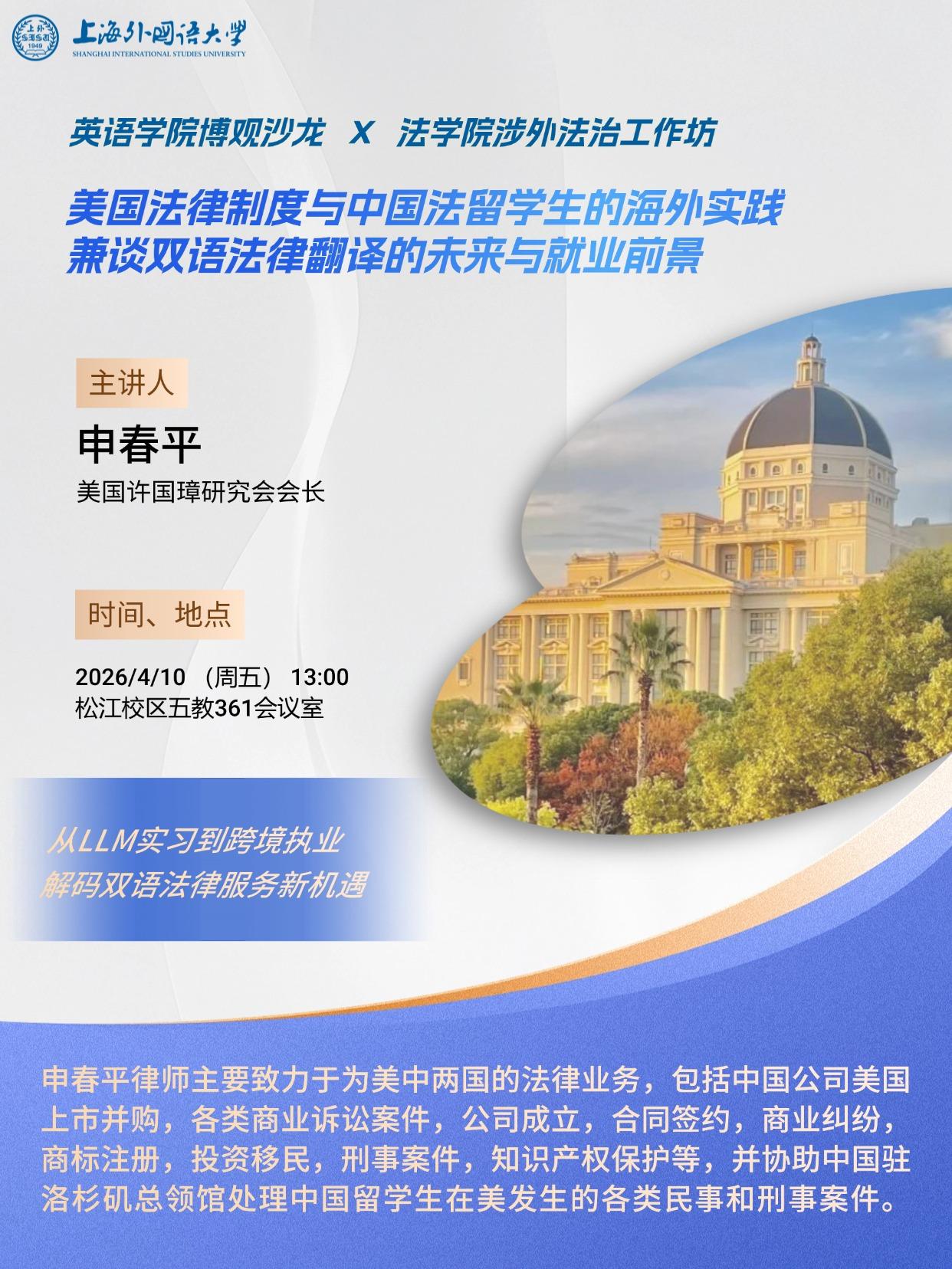 本讲座围绕美国法律制度的基本框架与实践运作展开,结合中国法学留学生在美实习与就业的实际路径,分析跨法域背景下的职业发展机会与挑战。同时,探讨双语法律翻译在国际法律服务中的重要作用及其未来发展前景。申春平律师将结合其在美国执业的丰富经验,用在美国的中国法学 LLM 项目留学生实习经历及相关案例探讨美国未来就业前景。