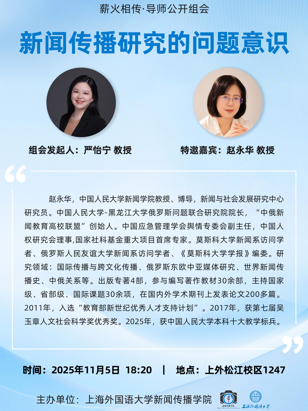 赵永华,中国人民大学新闻学院教授、博导,新闻与社会发展研究中心研究员。中国人民大学-黑龙江大学俄罗斯问题联合研究院院长,“中俄新闻教育高校联盟”创始人。中国应急管理学会舆情专委会副主任,中国人权研究会理事,国家社科基金重大项目首席专家。莫斯科大学新闻系访问学者、俄罗斯人民友谊大学新闻系访问学者、《莫斯科大学学报》编委。研究领域:国际传播与跨文化传播、俄罗斯东欧中亚媒体研究、世界新闻传播史、中俄关系等。出版专著4部,参与编写著作教材30余部,主持国家级、省部级、国际课题30余项,在国内外学术期刊上发表论文200多篇。 2011年,入选“教育部新世纪优秀人才支持计划”。2017年,获第七届吴玉章人文社会科学奖优秀奖。2025年,获中国人民大学本科十大教学标兵。
