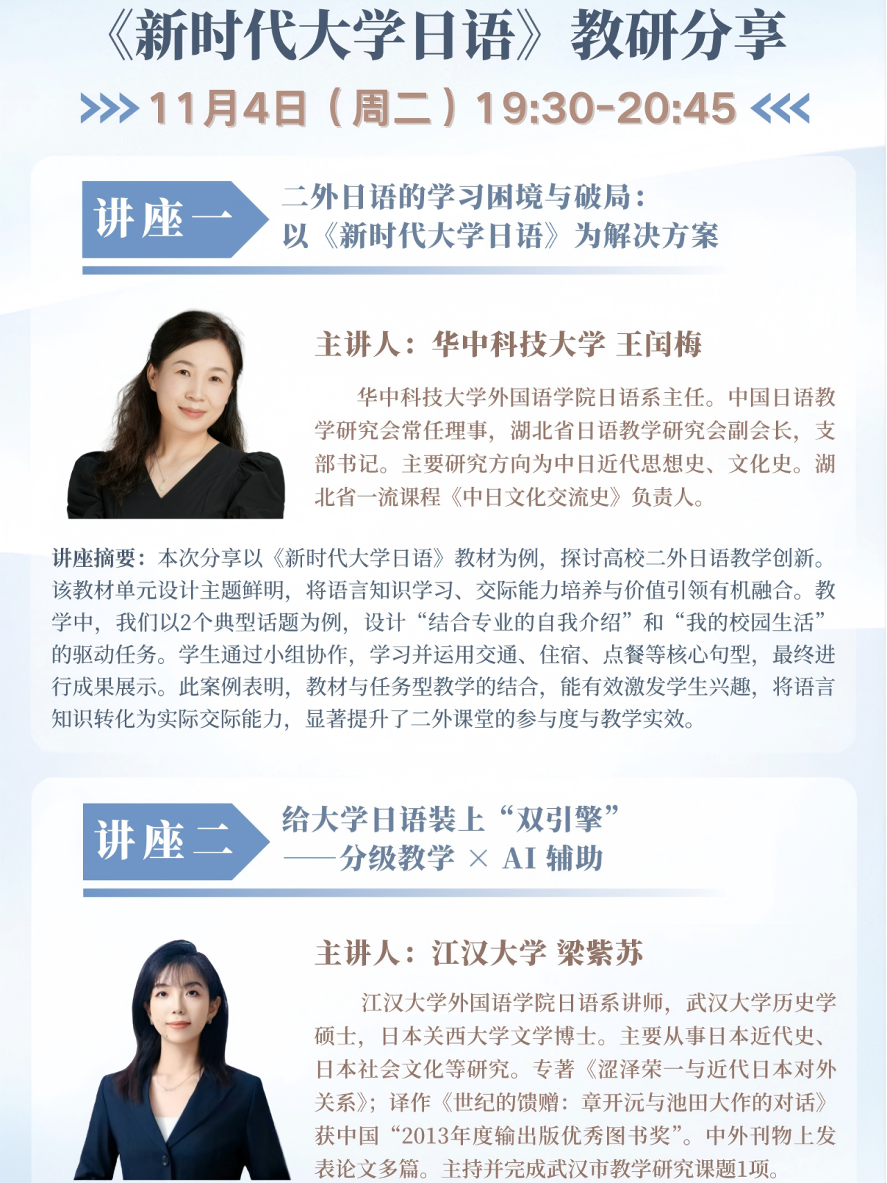 梁老师分享立足“课时少、差异大、评价难”的大学日语教学痛点,以江汉大学同一年级里多个班级为样本,汇报“高考分三级入班、两学期后滚动调整”的分级教学实践。同时初步尝试把AI设想嵌入教学环节,将雨课堂、学习通与外教社WE Learn 串联成 AI 引擎--依托WE Learn 在线平台采集学习数据,探索“智能推送+即时反馈”的轻量级应用,为后续知识图谱与数字人建设预留接口。课例《新时代大学日语2》第 11 课《バイトの面接》将从知识图谱建设、AI助教答疑、AI出题等方面,现场演示“AI预练一配音挑战一即时作文一AI助教答疑”等教学环节。通过提供可复制的分级标准和“零代码”AI试水方案,以期助力大学日语教师快速搭建“分级+AI”的“双引擎”智慧课堂。