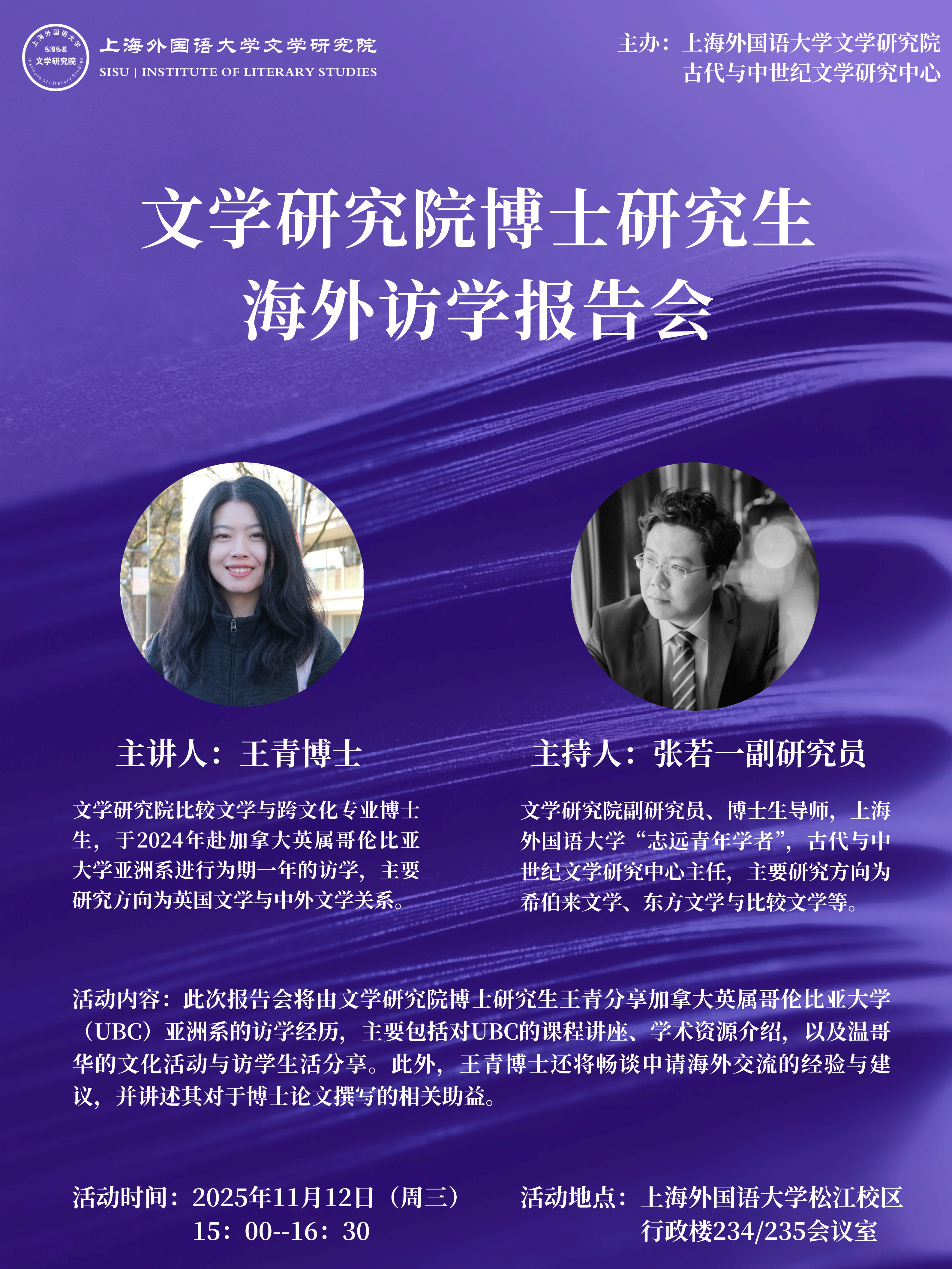 文学研究院比较文学与跨文化研究专业博士生,于2024年赴加拿大英属哥伦比亚大学亚洲系进行为期一年的访学,主要研究方向为英国文学与中外文学关系。