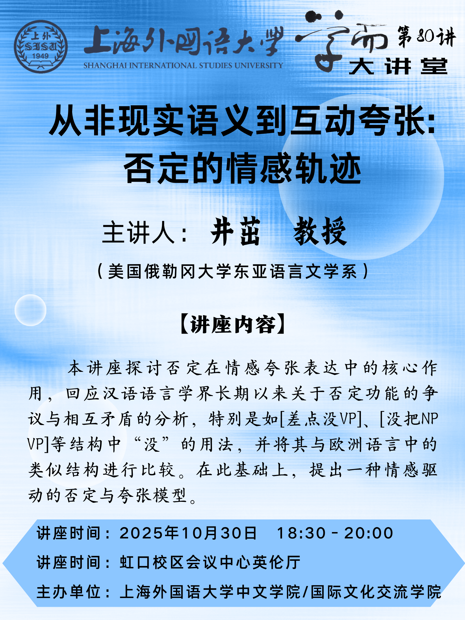 本讲座探讨否定在情感夸张表达中的核心作用,回应汉语语言学界长期以来关于否定功能的争议与相互矛盾的分析,特别是如[差点没VP]、[没把NP VP]等结构中“没”的用法,并将其与欧洲语言中的类似结构进行比较。在此基础上,提出一种情感驱动的否定与夸张模型。