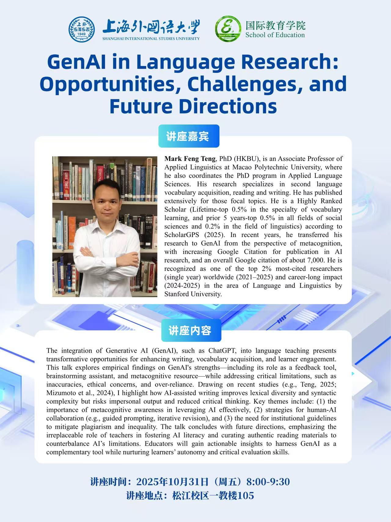 The integration of Generative AI (GenAI), such as ChatGPT, into language teaching presents transformative opportunities for enhancing writing, vocabulary acquisition, and learner engagement. This talk explores empirical findings on GenAI's strengths—including its role as a feedback tool, brainstorming assistant, and metacognitive resource—while addressing critical limitations, such as inaccuracies, ethical concerns, and over-reliance. Drawing on recent studies (e.g., Teng, 2025; Mizumoto et al., 2024), I highlight how AI-assisted writing improves lexical diversity and syntactic complexity but risks impersonal output and reduced critical thinking. Key themes include: (1) the importance of metacognitive awareness in leveraging AI effectively, (2) strategies for human-AI collaboration (e.g., guided prompting, iterative revision), and (3) the need for institutional guidelines to mitigate plagiarism and inequality. The talk concludes with future directions, emphasizing the irreplaceable role of teachers in fostering AI literacy and curating authentic reading materials to counterbalance AI’s limitations. Educators will gain actionable insights to harness GenAI as a complementary tool while nurturing learners’ autonomy and critical evaluation skills.