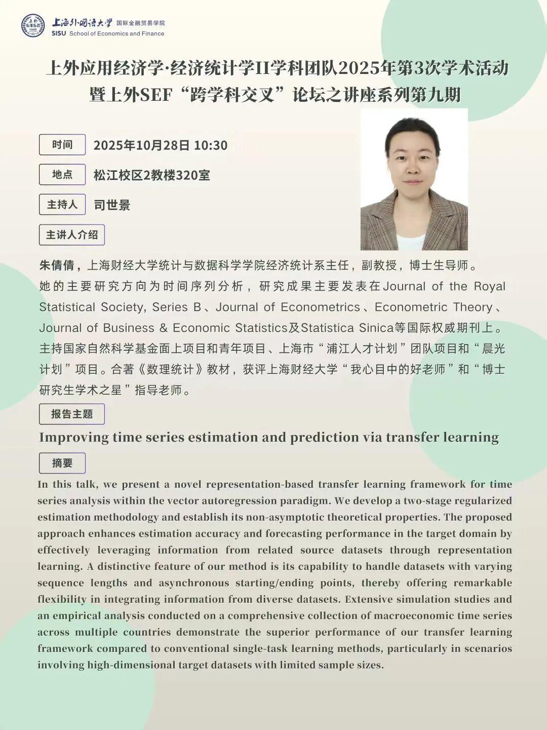 上海财经大学统计与数据科学学院经济统计系主任,副教授,博士生导师。她的主要研究方向为时间序列分析,研究成果主要发表在Journal of the Royal Statistical Society, Series B、Journal of Econometrics、Econometric Theory、Journal of Business & Economic Statistics及Statistica Sinica等国际权威期刊上。主持国家自然科学基金面上项目和青年项目、上海市“浦江人才计划”团队项目和“晨光计划”项目。合著《数理统计》教材,获评上海财经大学“我心目中的好老师”和“博士研究生学术之星”指导老师。