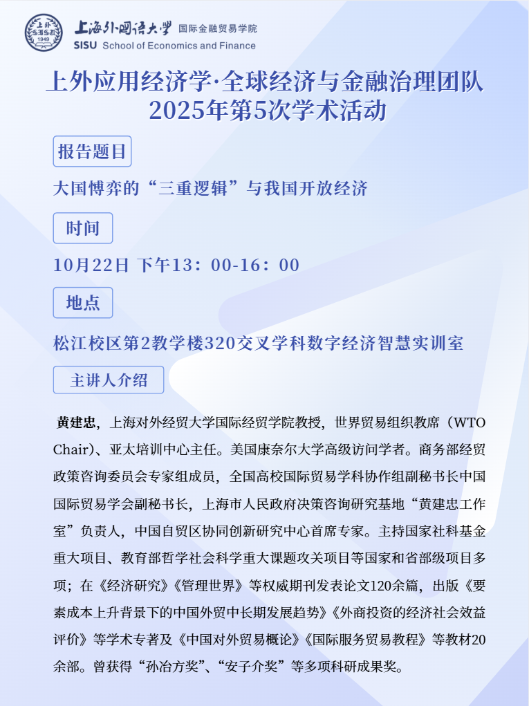 上海对外经贸大学国际经贸学院教授,世界贸易组织教席(WTO Chair)、亚太培训中心主任。美国康奈尔大学高级访问学者。商务部经贸政策咨询委员会专家组成员,全国高校国际贸易学科协作组副秘书长中国国际贸易学会副秘书长,上海市人民政府决策咨询研究基地“黄建忠工作室”负责人,中国自贸区协同创新研究中心首席专家。主持国家社科基金重大项目、教育部哲学社会科学重大课题攻关项目等国家和省部级项目多项;在《经济研究》《管理世界》等权威期刊发表论文120余篇,出版《要素成本上升背景下的中国外贸中长期发展趋势》《外商投资的经济社会效益评价》等学术专著及《中国对外贸易概论》《国际服务贸易教程》等教材20余部。曾获得“孙冶方奖”、“安子介奖”等多项科研成果奖。