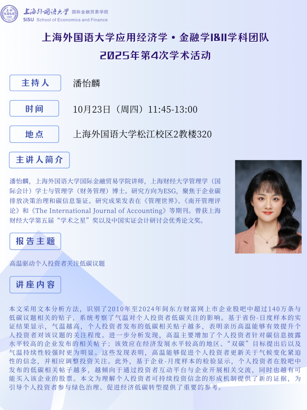 上海外国语大学国际金融贸易学院讲师,上海财经大学管理学(国际会计)学士与管理学(财务管理)博士。研究方向为ESG,聚焦于企业碳排放决策治理和碳信息鉴证。研究成果发表在《管理世界》、《南开管理评论》和《The International Journal of Accounting》等期刊。曾获上海财经大学第五届“学术之星”奖以及中国实证会计研讨会优秀论文奖。