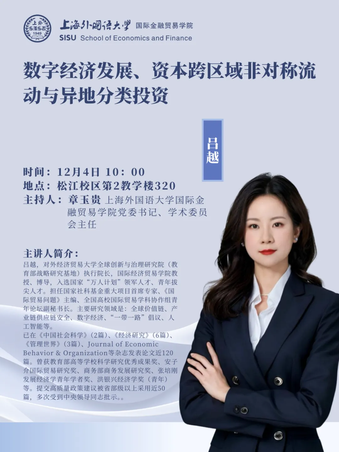 对外经济贸易大学全球创新与治理研究院(教育部战略研究基地)执行院长,国际经济贸易学院教授、博导,入选国家“万人计划”领军人才、青年拔尖人才。担任国家社科基金重大项目首席专家、《国际贸易问题》主编、全国高校国际贸易学科协作组青年论坛副秘书长。主要研究领域是:全球价值链、产业链供应链安全、数字经济、“一带一路”倡议、人工智能等。